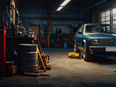 A vintage car stands prominently in a dimly lit auto repair shop, surrounded by various tools and equipment, creating a unique industrial ambiance that showcases craftsmanship.