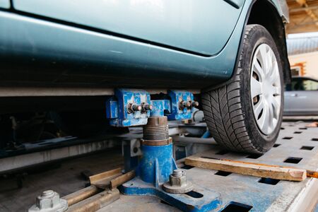Close-up on lifted automobile held for annual engineering checkup and damage fix. Machine repair workers laboring in modern service station. Blurred background