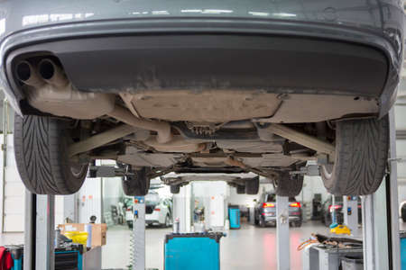 Car service center concept, vehicle raised on lift at maintenance station, auomobile repair and check up, repairing car