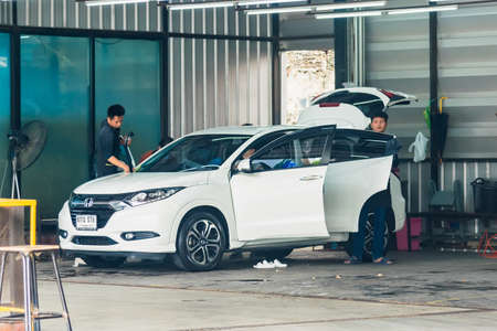 Bangkok, Thailand - December, 13, 2020 : Car wash shop workers Polishing, car paint Cleaning the car Polish the paint for the shine of the car at Bangkok, Thailand