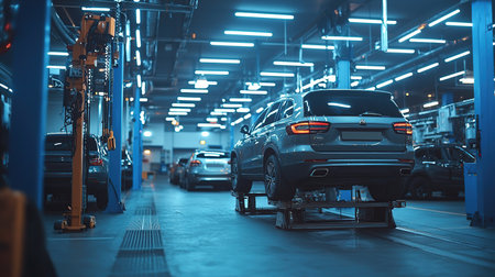 car service centre with auto at repair station bokeh light defocused blur background