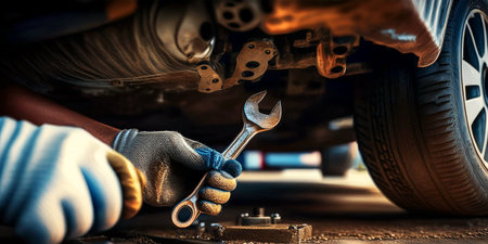 Extreme close-up of the gloved hands of auto mechanic holding a wrench while repairing chassis of a vehicle in a car workshop from underneath the car. Generative Ai.