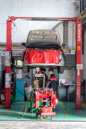 Surabaya, Indonesia - September 15, 2021: Maintenance and oil change in auto repair shop