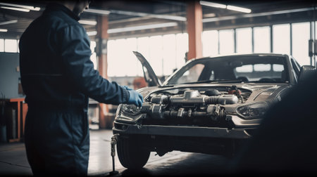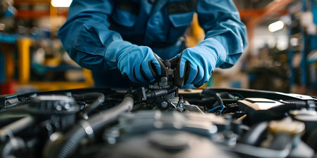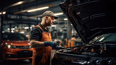 Automotive mechanic working on a car engine, performing vehicle repair and maintenance check with tools in a garage, ensuring proper functioning and service