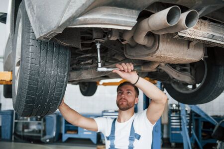 Mechanic unscrewing parts of automobiles bottom under lifted car