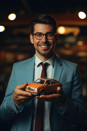 Handsome young businessman in suit and eyeglasses holding toy car in cafe