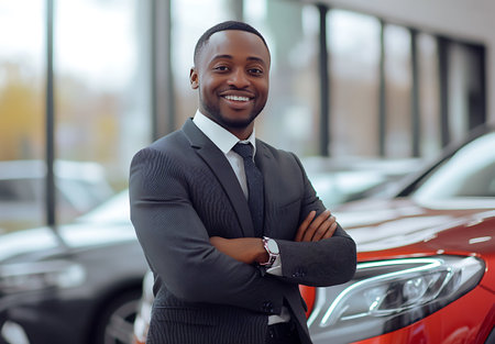 Confident Indian salesman in a suit smiling in a luxury car showroom