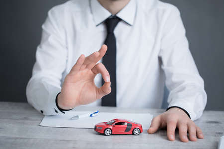 Businessman, car dealer smiling to the camera, handshaking the agreement. The wooden car's model on the desk. Insurance details, car rental. Safe Vehicle Concept.