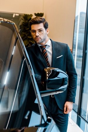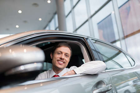 Luxury look. Man in official clothes trying his new car in automobile salon.