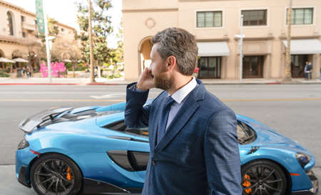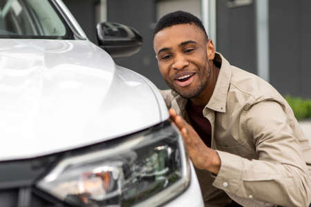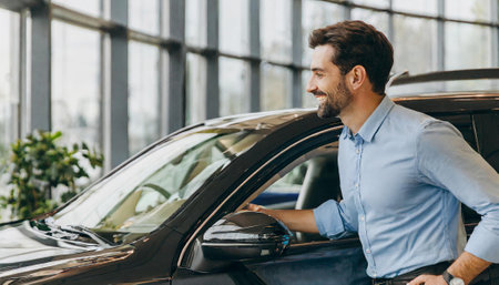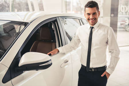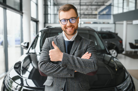 happy caucasian guy now the owner of business class auto. man make purchase in dealership, his new representative car stand next to him