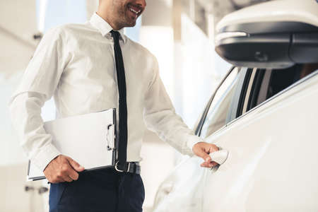 Handsome car dealership worker in suit is holding a folder and smiling while opening car