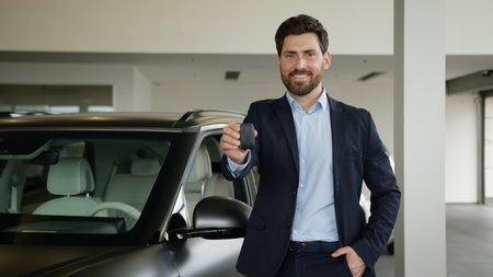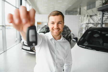 Happy Caucasian adult man client buyer auto showroom dealer automobile new car owner male showing key insurance credit sale salon purchase vehicle guy transport electric customer businessman business