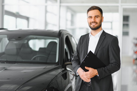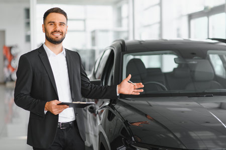 Professional man presenting a new black car in an automotive dealership, holding a clipboard and discussing sales