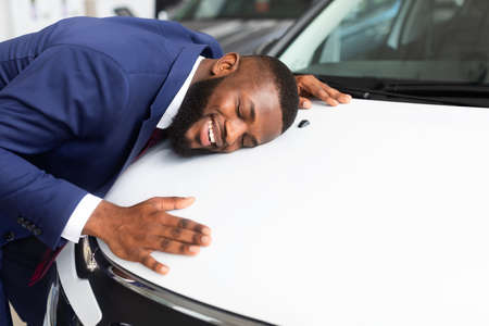 Cheerful African Businessman In Suit Leaning On Hood Of His New Car