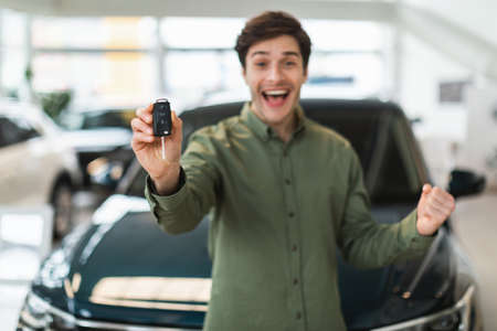 Excited young Caucasian man showing new car key at camera, gesturing YES, celebrating purchase of auto at dealership