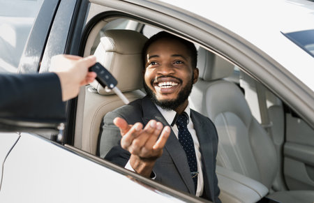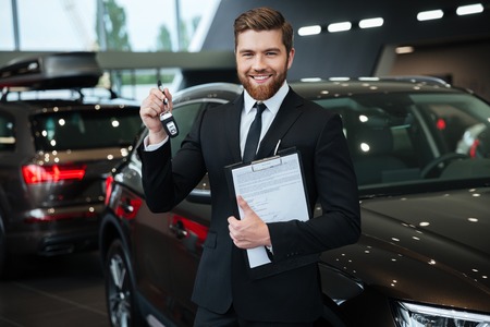 Great choice, salesman giving car key to customer, expert advice on renting and buying auto.
