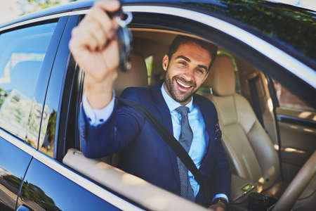 Im on my way to an important meeting. Portrait of a cheerful young businessman holding up keys to the camera while being seated in his car.