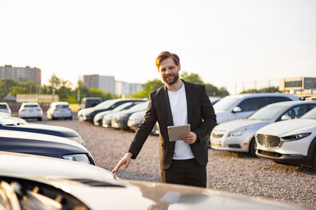 A car salesman in a suit, smiling and holding a tablet, points to a car in a car lot. Cars are parked in rows in the background.