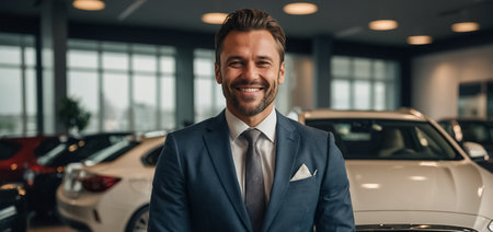Good looking, cheerful and friendly salesman poses in a car salon or showroom