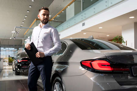 Handsome car dealership worker in suit is holding a folder, looking at camera and smiling while standing near the car