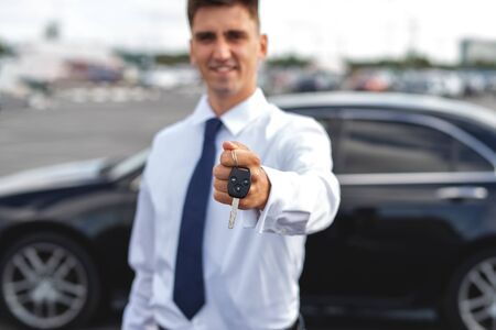 Confident young salesman showing car key at camera in modern dealership, selective focus