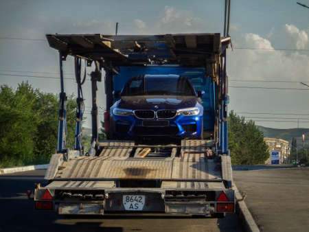 Kazakhstan, Ust-Kamenogorsk, June 26, 2020: BMW M5 (F90). Blue BMW on a car carrier trailer