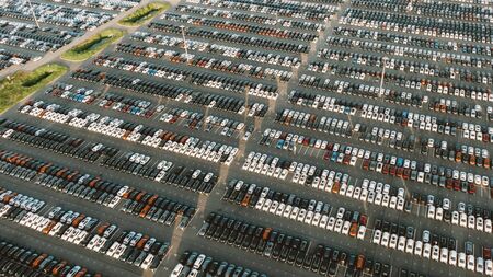 Giant parking of new cars at an automobile factory, aerial view. Overproduction crisis, economic crisis due to the coronavirus pandemic.