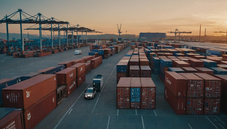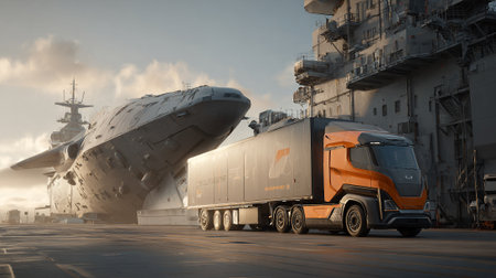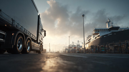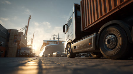 Modern Semi-Truck Cargo Transportation with Sunset at Port for Global Commerce
