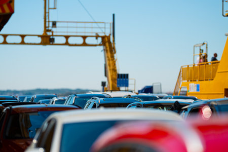 View from behind the car Cars in traffic jam on ferry, sea crossing by ferry