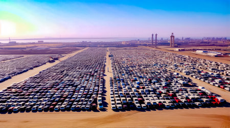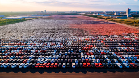 an aerial photo capturing the organized arrangement of brand-new cars lined up at the port, ready for import and export logistics. This scene highlights the efficiency of the supply chain from the port to the dealership.