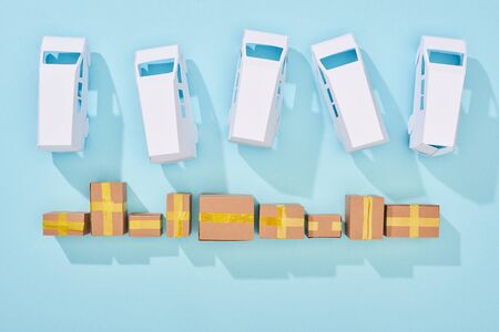 top view of closed cardboard boxes near white vans on blue background with copy space