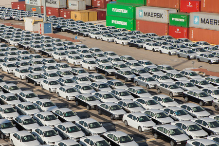 Rows of new cars parked in an international port