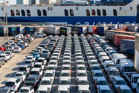 Barcelona, Spain - July 8th 2018 , Cars ready for shipping and export and the harbour of Barcelona