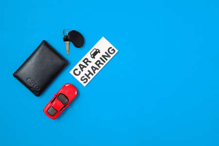 Car sharing concept. Composition with driver's license, vehicle key, toy car, text sign CAR SHARING on blue background. Top view. Taxi alternative, temporary car rental, sharing economy