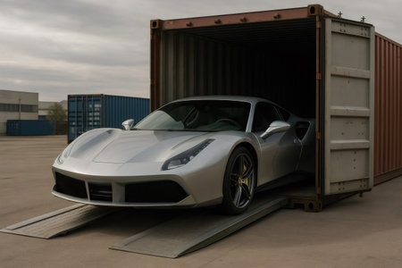 Luxury sports car being unloaded from metal shipping container at an industrial site, symbolizing international trade and vehicle logistics