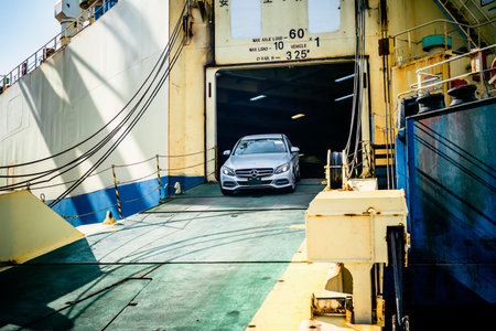 Vladivostok, Russia - 3 March 2024: unloading of new car from the ship in sea port of Vladivostok, Russia