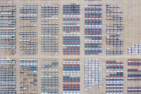 New car lined up aerial view. Port of import and export business logistic to dealership for sale. Automobile and automotive car parking lot for commercial business industry.