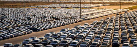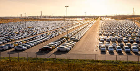 Rows of a new cars parked in a distribution center on a sunny day in the spring, a car factory. Parking in the open air.