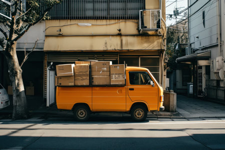 an orange van travels down the street with several boxes.