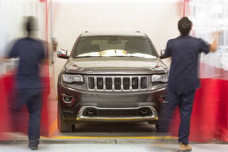 Blurred abstract image of man worker with car in a body shop. Blur car auto service. Car bokeh. Blurred background with car in garage. Vehicle maintenance in auto repair service. Blurry service station