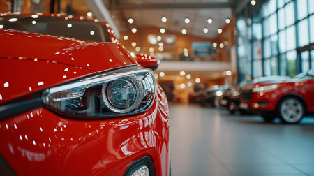 Blurred photo new red car parked in showroom. Car dealership office. Car parked in showroom with care. Auto for sale and rent business. Automobile leasing market. Electric vehicle. Luxury car company.