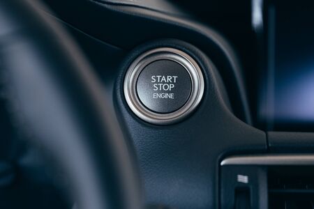 close-up of car start and stop button. Modern car interior with dashboard and cockpit details