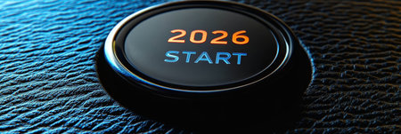Illuminated Start Engine Button with Blue 2026 Text on Black Leather Surface for Future Innovation