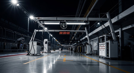 A dark and futuristic race track pit lane illuminated by bright lights, featuring industrial equipment and a digital timer displaying zero time.