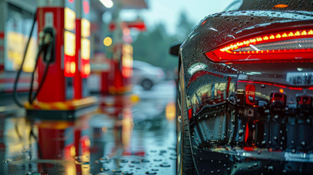 Close-up of a car being refueled at a gas station on a rainy day. The background is blurred, focusing on the fuel nozzle. Concept of transportation.