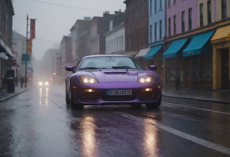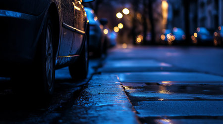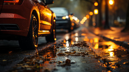 Rainy city street with cars. A black car is parked on a wet cobblestone street and other automobile driving down the street in the background, creating a moody atmosphere. Autumnal road in the evening