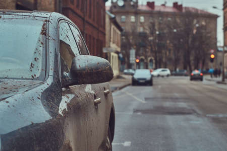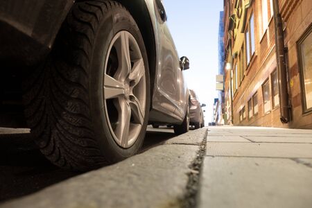 Close up of a car parked illegally against traffic rules on pedestrian city street side