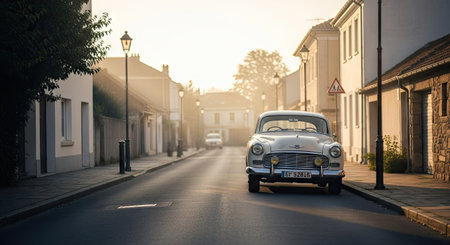 An antique car is parked on a cobblestone street, surrounded by buildings. The scene is bathed in sunlight, casting soft shadows. The composition features a symmetrical arrangement with the car as the focal point. This image could be suitable for various editorial and commercial applications.