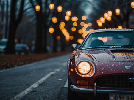 This captivating autumn street scene captures cars driving through a city adorned with golden leaves. The vibrant colors and architecture evoke a warm and inviting atmosphere perfect for seasonal exploration.