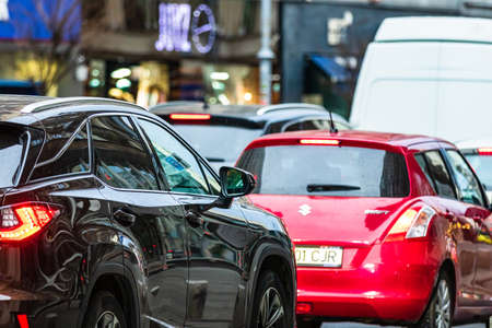 Cars in traffic at rush hour in downtown area of the city. Car pollution, traffic jam in the morning and evening in the capital city of Bucharest, Romania, 2021